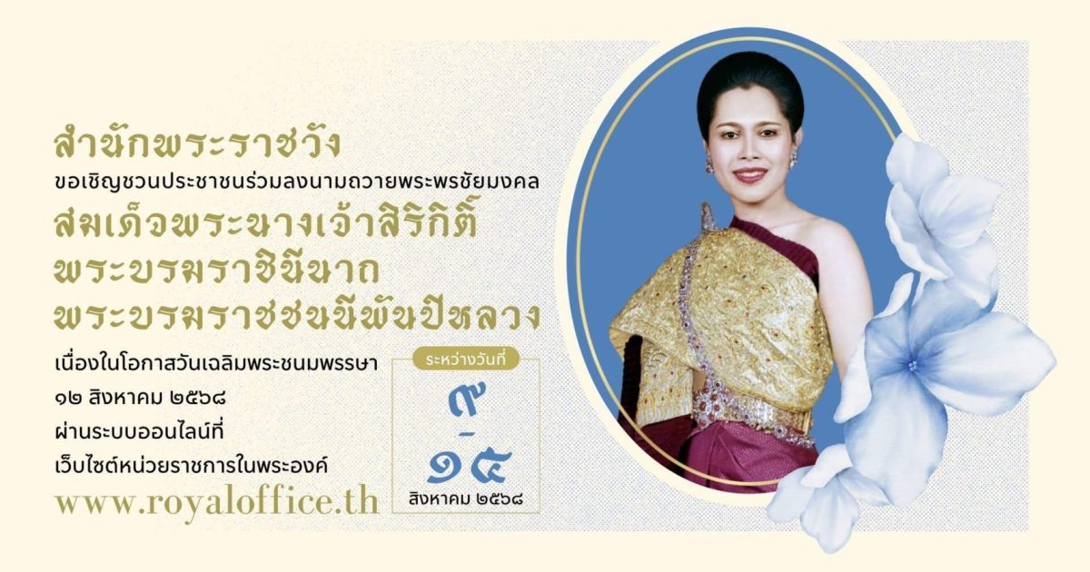 ขอเชิญชวนประชาชนร่วมลงนามถวายพระพรชัยมงคล สมเด็จพระนางเจ้าสิริกิติ์ พระบรมราชินีนาถ พระบรมราชชนนีพันปีหลวง วันที่ ๑๒ สิงหาคม ๒๕๖๘