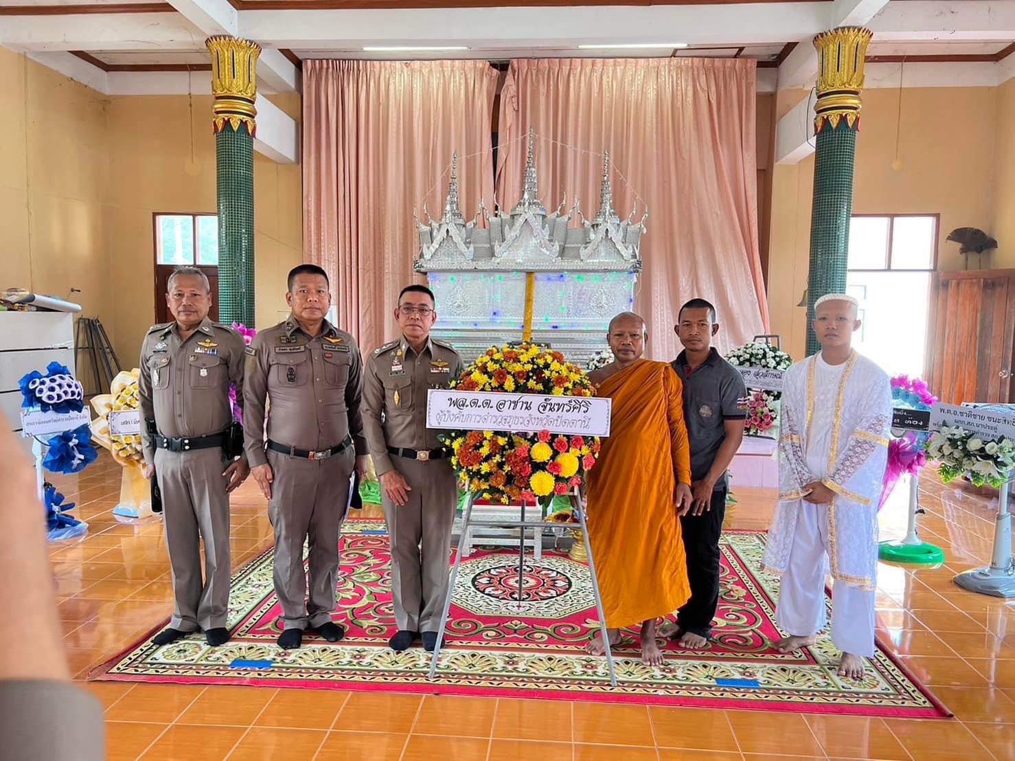 พล.ต.ต.อาชาน จันทร์ศิริ ผบก.ภ.จว.ปัตตานีร่วมวางพวงหรีดเคารพศพ งานบำเพ็ญกุศลศพ นางปราณี รามศรี 15 เมษายน 2567 โดย admin / ข่าวภารกิจผู้บังคับบัญชา วันที่ 3 ตุลาคม 2566 เวลา 09.40 น.พล.ต.ต.อาชาน จันทร์ศิริ ผบก.ภ.จว.ปัตตานีร่วมวางพวงหรีดเคารพศพ งานบำเพ็ญกุศลศพ นางปราณี รามศรี มารดาของจ.ส.ต.นพวิชัย อินทไชย และ ส.ต.ท.ประวิทย์ อินทไชย ผบ.นปพ.สภ.โคกโพธิ์ ฯ ณ วัดนิคมสถิตย์(ยางแดง). ต.มะกรูดอ.โคกโพธิ์ จ.ปัตตานี โดยมี พ.ต.อ.จำลอง สุวลักษณ์ ผกก.สภ.โคกโพธิ์ ให้การต้อนรับ FacebookFacebookXXLINELine