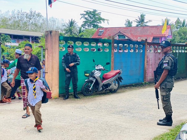 ด.ต.กอเดช แหเหล็ม จนท.ตำรวจชุด ตชส. ออกปฏิบัติหน้าที่รักษาความปลอดภัยครู และนักเรียน รร.บ้านสามยอด