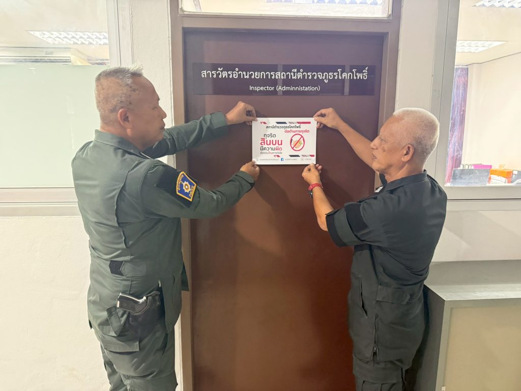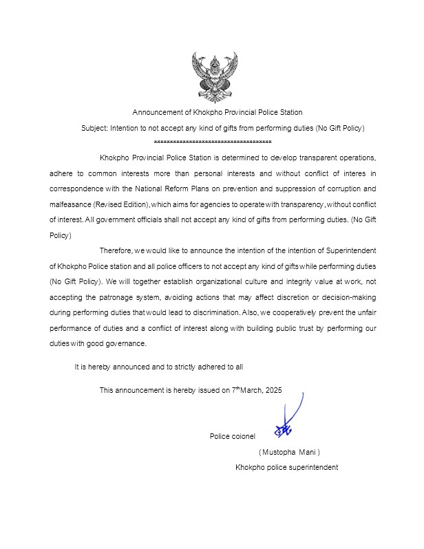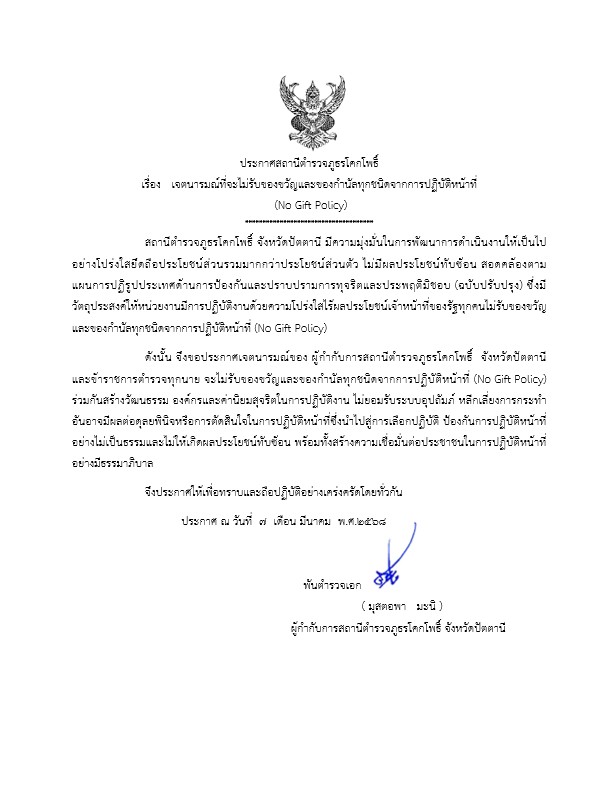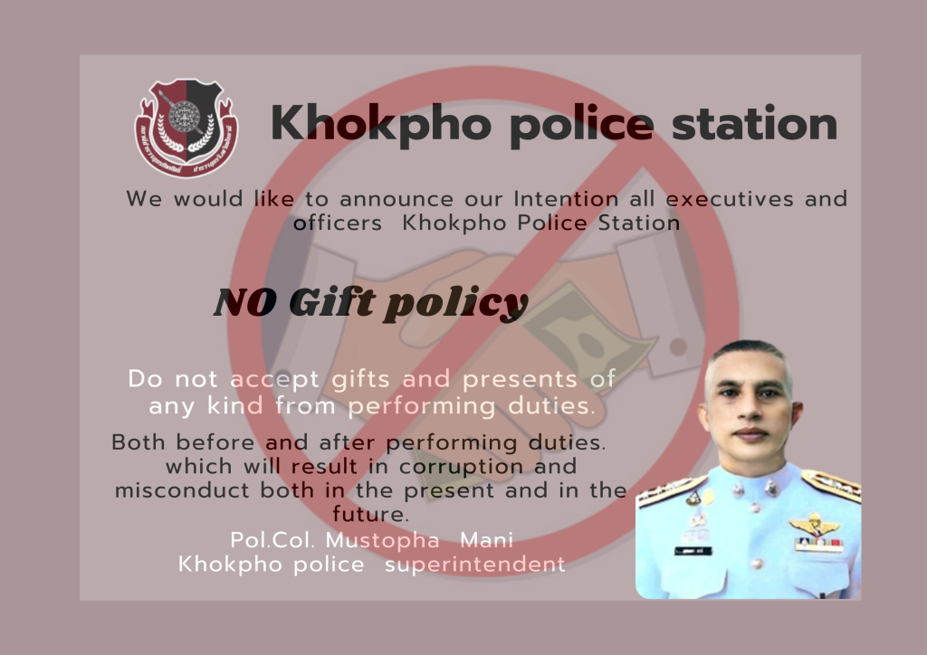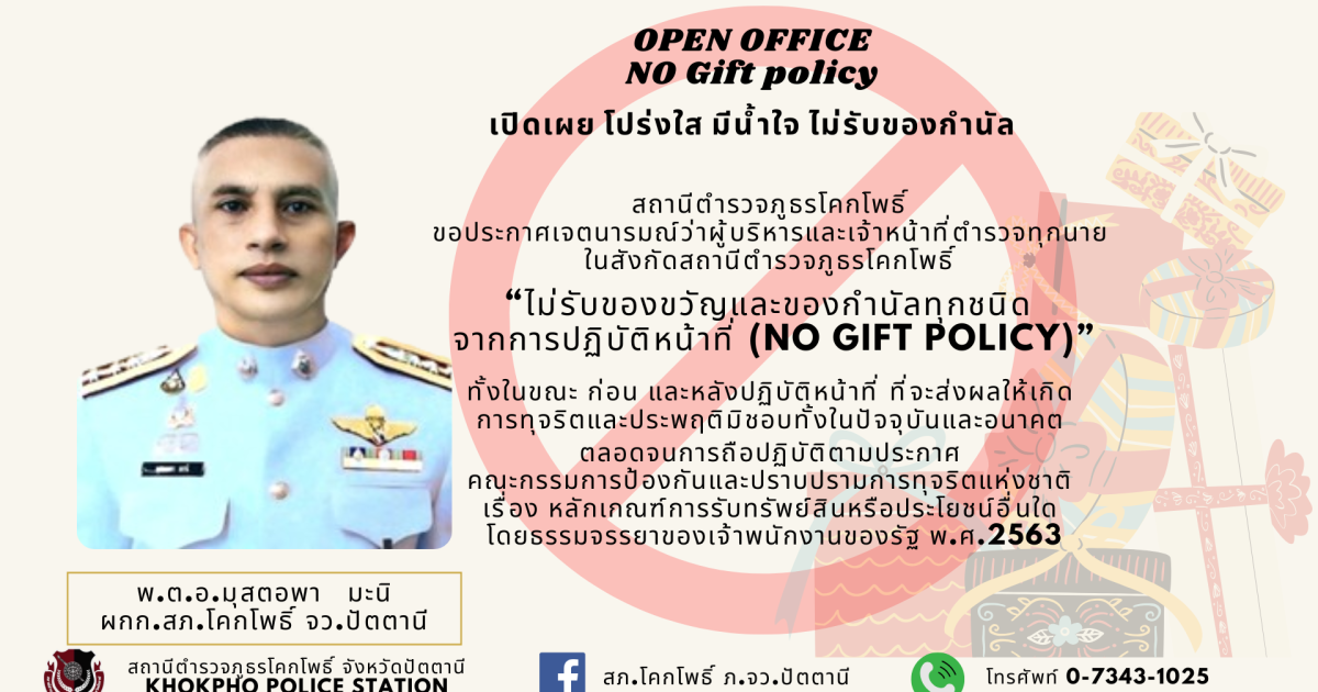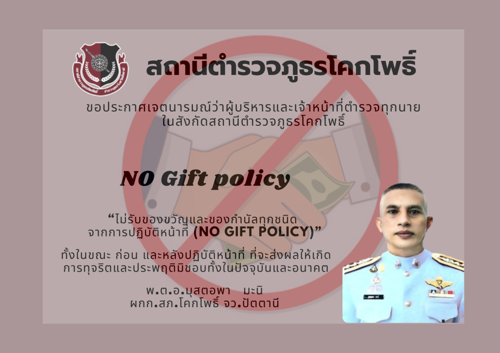 พร้อมข้าราชการตำรวจในสังกัด ร่วมประกาศเจตนารมณ์ที่จะไม่รับของขวัญและของกำนัลทุกชนิดจากการปฏิบัติหน้าที่ (No Gift Policy) ทุกสายงาน ณ สภ.โคกโพธิ์