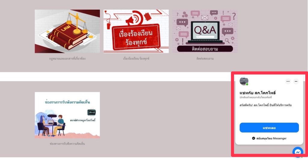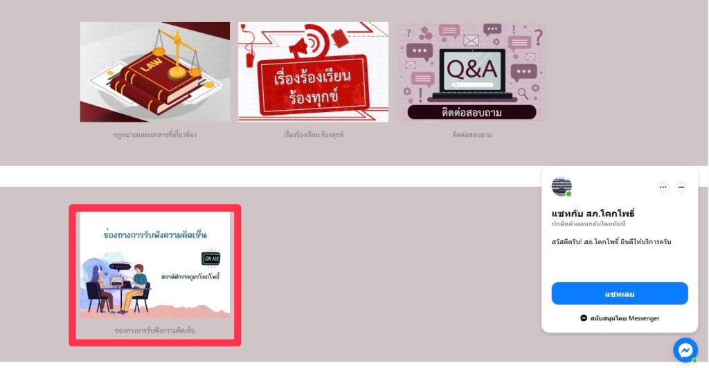 เมนู ช่องทางการถาม-ตอบ/รับฟังความคิดเห็น อยู่บริเวณหน้าแรกของเว็บไซต์